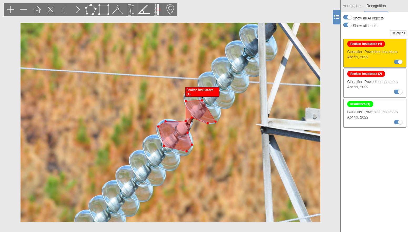 - Image labeling Process: Identification of the asset (insulator) and the defect (crack) is the first step in AI Classifier development.