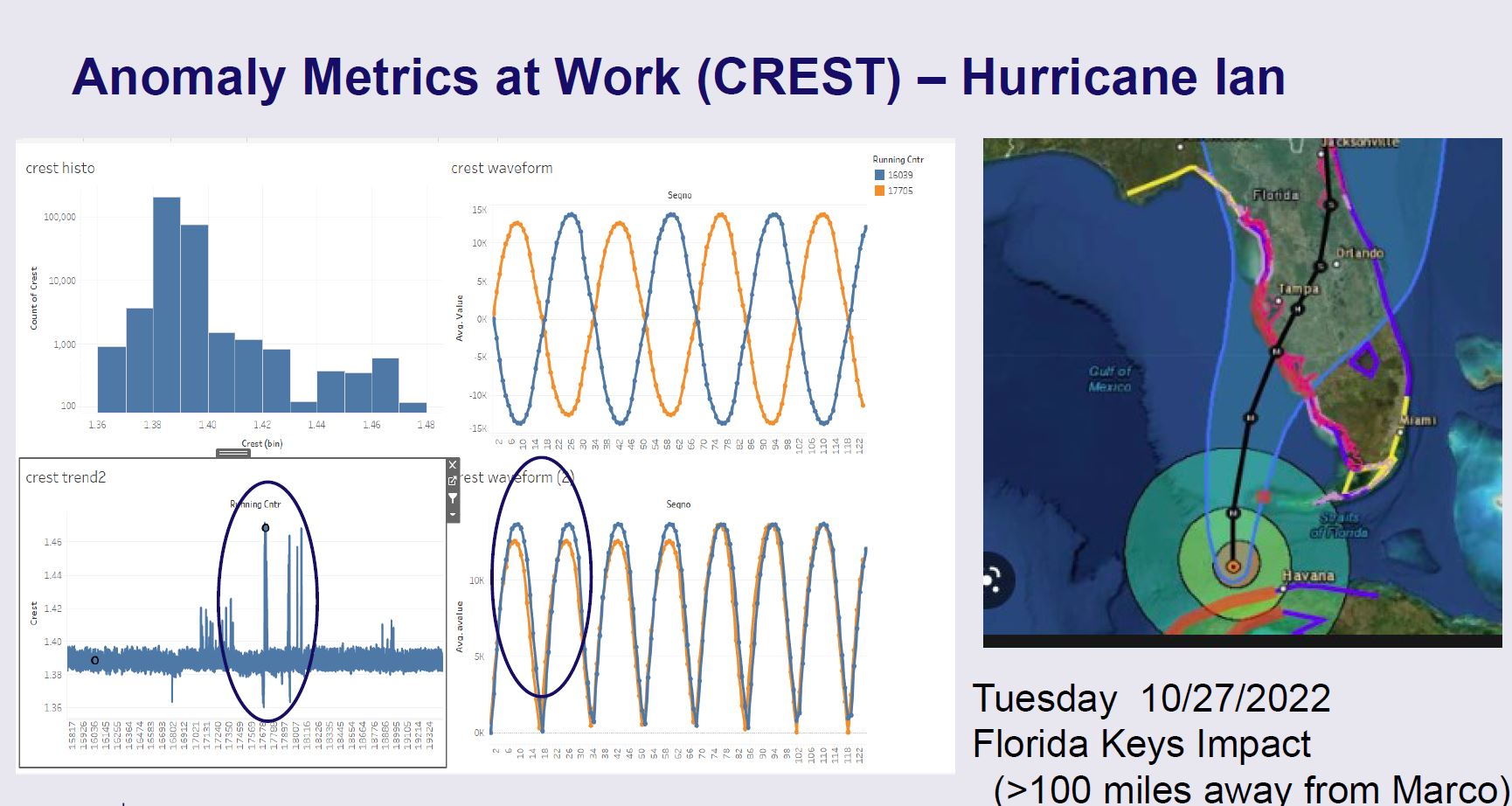 The first step in benchmarking and validating the algorithms is to establish a baseline of nominal values and the allowable variations for all three metrics. This is accomplished by recording over 180,000,000 ½ cycles for almost three weeks of “blue sky” days on a midwestern grid. Figure 5 shows the results of this recording and calculating the crest factor showing the minor variations detected over the entire period.